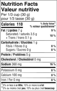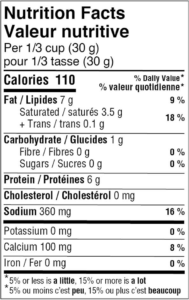 Cheese made from skim milk (pasteurized skim milk, bacterial cultures, salt, enzymes), palm oil, water, modified potato starch, natural flavor, salt, lactose, sodium citrate, lactic acid, sodium phosphate, potassium phosphate, sorbic acid (preservative), beta-apo-8′-carotenal (color), beta-carotene (color), annatto (color), turmeric (color), anti-caking blend (powdered cellulose, dextrose, enzyme, natamycin (preservative)).